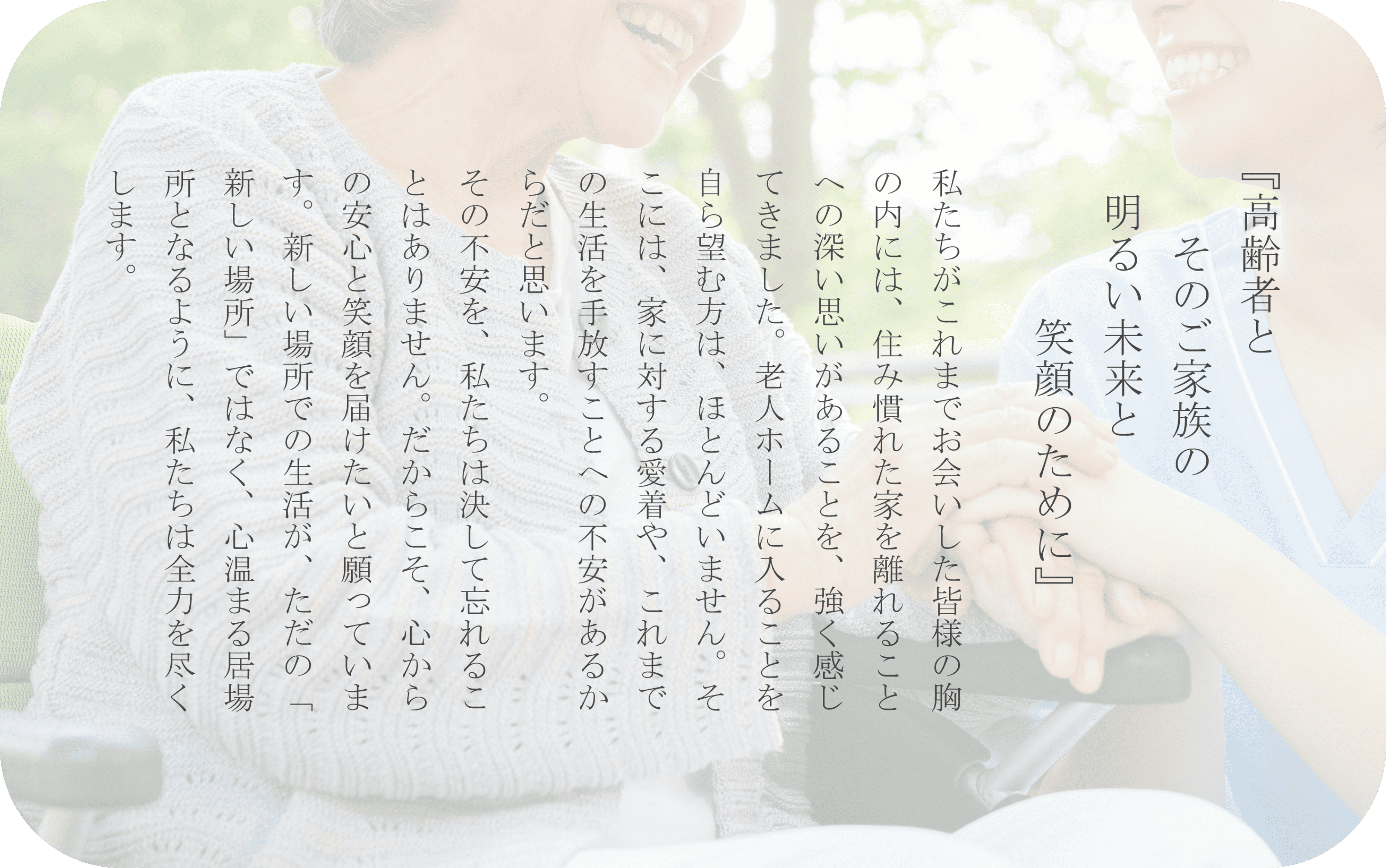 ご入居するご本人はもちろん、そのご家族にも選んでよかったと思ってもらえるような施設をお探しします。大切な施設探しを後悔のないようお手伝いします。