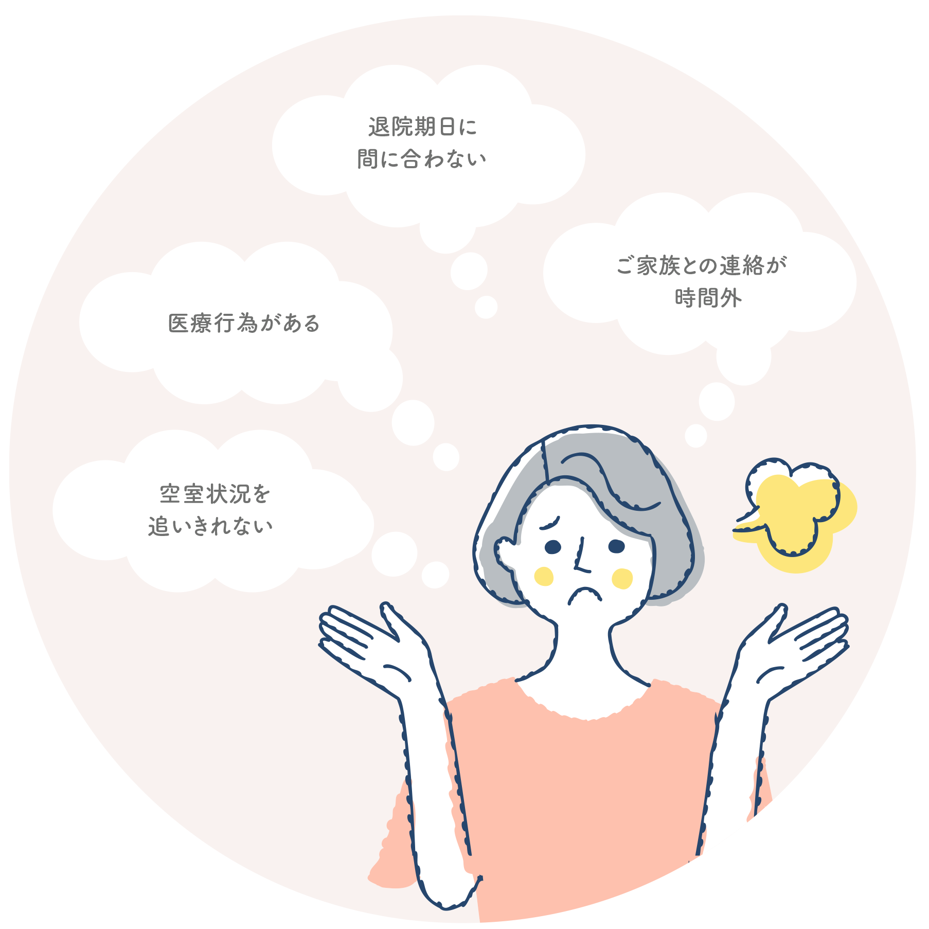 ケアプランの作成や定期訪問やアセスメントはケアマネージャーさんにしか出来ません。通院調整や患者様への相談支援はソーシャルワーカーさんにしか出来ません。専門職の皆様にしか出来ない重要な役割を手厚くして頂けるように、私達に老人ホーム探しという部分をお任せください。